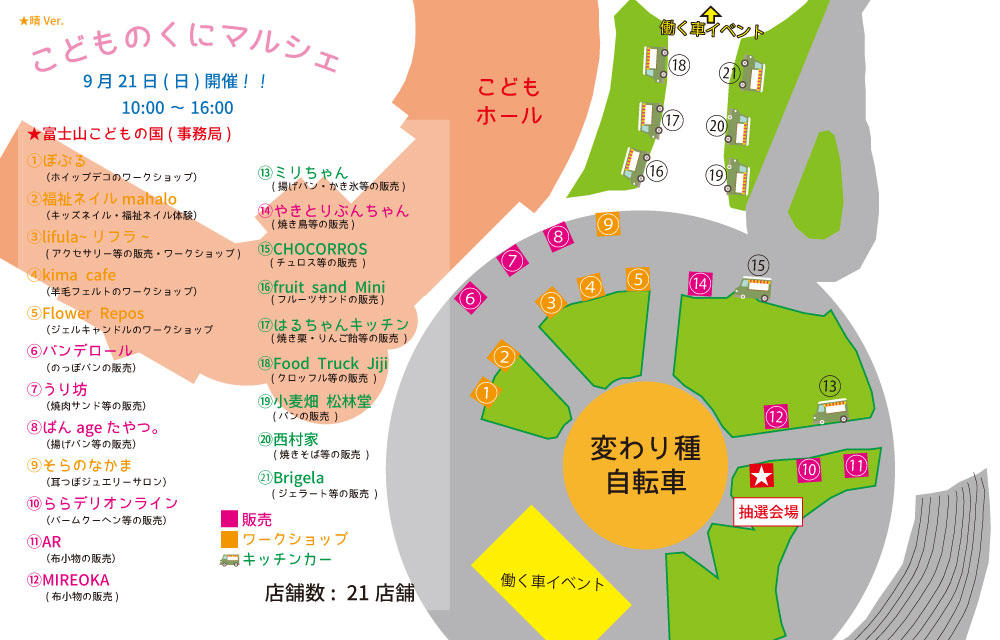 ★1.ぽぷる(ホイップデコのワークショップ) ★2.福祉ネイルmahalo(キッズネイル・福祉ネイル体験) ★3.lifula(アクセサリー等の販売・ワークショップ) ★4.kima cafe(羊毛フェルトのワークショップ)※キャンセル ◇5.Flower Repos(ジェルキャンドルのワークショップ) ★6.バンデロール(のっぽパンの販売) ◇7.うり坊(焼肉サンド等の販売) ★8.ぱんageたやつ。(揚げパン等の販売) ★9.そらのなかま(耳つぼジュエリーサロン) ★10.ららデリオンライン(バームクーヘン等の販売) ◇11.AR(布小物等の販売) ◇12.MIREOKA(布小物等の販売) ★13.ミリちゃん(揚げパン・かき氷等の販売) ★14.やきとりぶんちゃん(焼き鳥等の販売) ★15.CHOCORROS(チュロス等の販売) ★16.fruit sand Mimi(フルーツサンドの販売) ★17.はるちゃんキッチン(焼き栗・りんご飴等の販売) ◇18.Food Truck Jiji(クロッフル等の販売) ★19.小麦畑 松林堂(パンの販売) ★20.西村家(焼きそばの等販売) ★21.Brigela(ジェラート等の販売) |